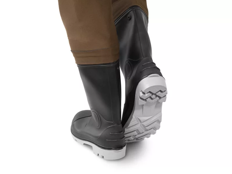Díky hnědé barvě nebudou rybí sliz a jiné skvrny na povrchu tak viditelné. V přední klasické neoprenové kapse lze uložit drobnosti, jako je například rybářský lístek. Není třeba se obávat klečení, neboť v oblasti kolen je obuv zesílena dvojitou vrstvou neoprenu. Nastavitelné ramenní popruhy jsou opatřeny neoprenovou podšívkou pro větší pohodlí během celodenního rybaření. Pod ramenními popruhy se nachází dva plastové kroužky, na kterých lze pomocí elastických pásků uchovávat různé doplňky, například měřicí pásku nebo kleště. Součástí balení je také brodící pás, který zabraňuje vniknutí vody do obuvi v případě uklouznutí nebo pádu. Oblast boty má odolnou a stabilní podrážku, která odolá i těm nejtěžším podmínkám. Jsou podšity neoprenovou stélkou, aby lépe chránily naše nohy před chladem.