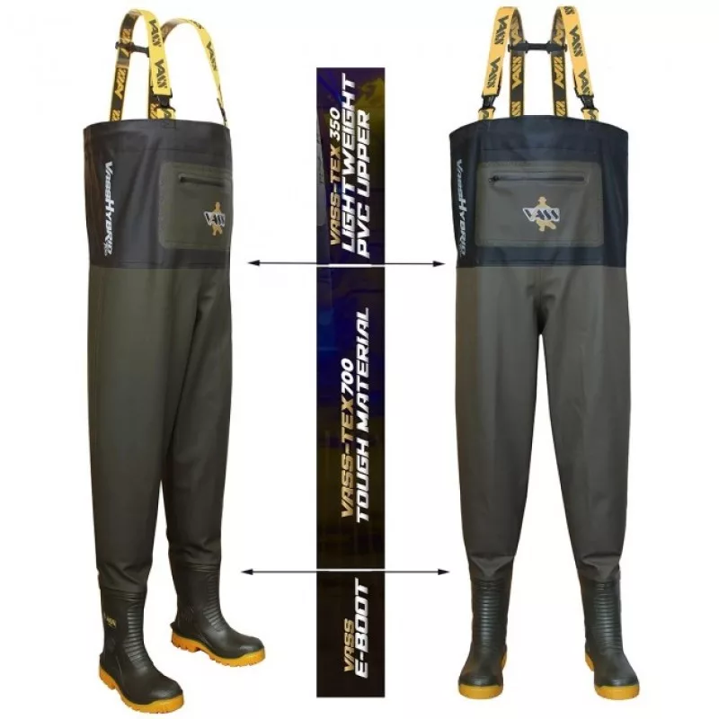 Velký důraz byl kladen také na praktičnost: k dispozici je vnější náprsní kapsa na zip a vnitřní kapsa, aby nejdůležitější drobnosti byly vždy po ruce a v bezpečí. Vnitřní náprsní kapsa je nastavitelná stahovací šňůrkou a zarážkami, takže dokonale padne na tělo. U nohou zajišťují stabilitu a bezpečnou chůzi odolné a vynikající přilnavé boty 'Vass E Boot' i na kluzkém, nerovném terénu, ať už jde o bláto nebo skalnaté dno.