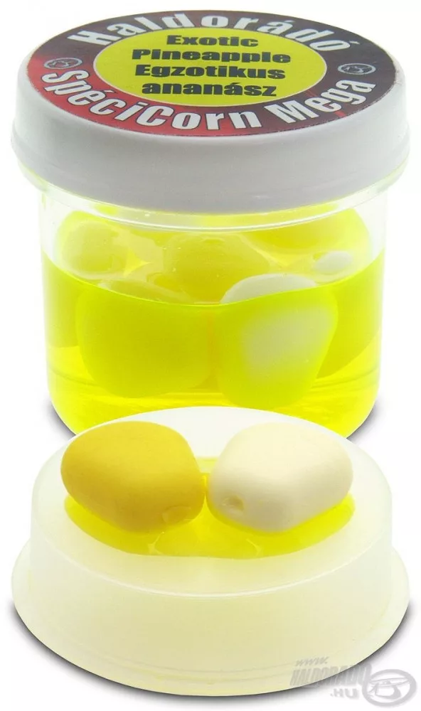 SpéciCorn Mega nie je nič iné ako veľká, ochutená, farebná, plávajúca gumová kukurica. Tieto pružné, veľké nástrahy sa osvedčia v každej situácii! Sú odolné voči najhladnejším malým rybám, dokonca ani sumček trpasličí ich nedokáže „odstrániť“ z vlasového nadväzca. Vďaka ich odolnosti získame čas a môžeme si byť istí, že ich lákavú arómu skôr či neskôr pocítia aj veľké ryby plávajúce v okolí! SpéciCorn Mega už v názve naznačuje svoju veľkosť, ktorá je trojnásobkom našej tradičnej gumovej kukurice. Každá téglik obsahuje minimálne dve rôzne farebné varianty. Žltá „základná nástraha“ nesmie chýbať pri žiadnej príchuti, ktorú sme doplnili špeciálnymi, s danou arómou harmonizujúcimi fluo gumovými kukuricami. V tégliku sa nachádza žltá a biela gumová kukurica.